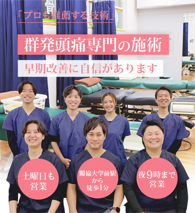 まず、首周りは特に頚椎の歪みを当院独自の矯正法で正して血流を改善し、群発頭痛を軽減させます。